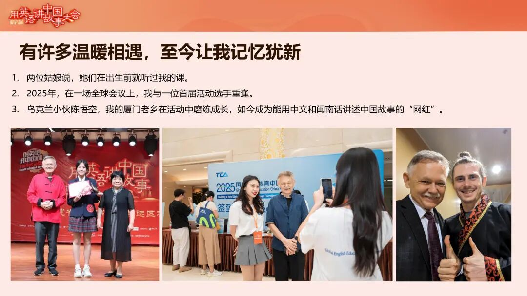 • 今年,在一场全球会议上,我与一位首届活动选手重逢。她不仅依然记得我,如今更已成为一名英语教师,致力于传播中国故事。