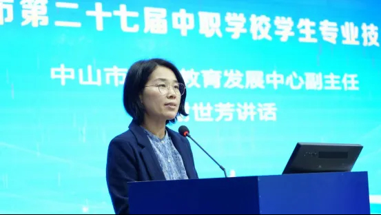 中山市职业教育发展中心副主任谢世芳在开幕式上发表讲话。谢世芳指出,学生专业技能竞赛是展示职业教育办学成果的重要载体,也是推动“岗课赛证”融合育人的有效抓手。谢世芳在讲话中系统回顾了近年来中山市职业教育在深化产教融合、校企协同育人等方面取得的积极成效,并回顾了中山职教学子在2025年世界职业院校技能大赛总决赛争夺赛中取得3金8银4铜的优异成绩。谢世芳表示,这一成绩充分体现了中山职业教育扎实的办学基础和良好的人才培养成效,也为全市中职学校进一步深化技能人才培养注入了信心与动力,希望全体选手在比拼中锤炼本领,在交流中拓宽视野,在挑战中成长进步。