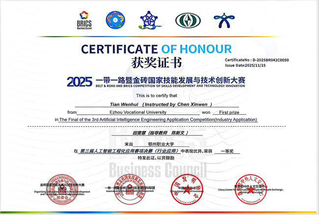 (通讯员 杨婷)近日,在2025年一带一路暨金砖国家技能发展与技术创新大赛中,鄂州职业大学信息工程学院学子表现优异,在首届DeepSeek大模型及行业AI应用开发赛项全国总决赛和第三届人工智能工程化应用赛项(行业应用)总决赛中连续荣获一等奖,实现“双线夺魁”,彰显出鄂州职业大学在AI技术技能人才培养方面的突出实力。