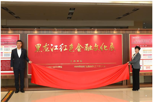 省委金融工委专职副书记田元元与哈尔滨金融学院党委副书记、工会主席黄强共同为黑龙江红色金融文化展揭牌,正式拉开展览帷幕。