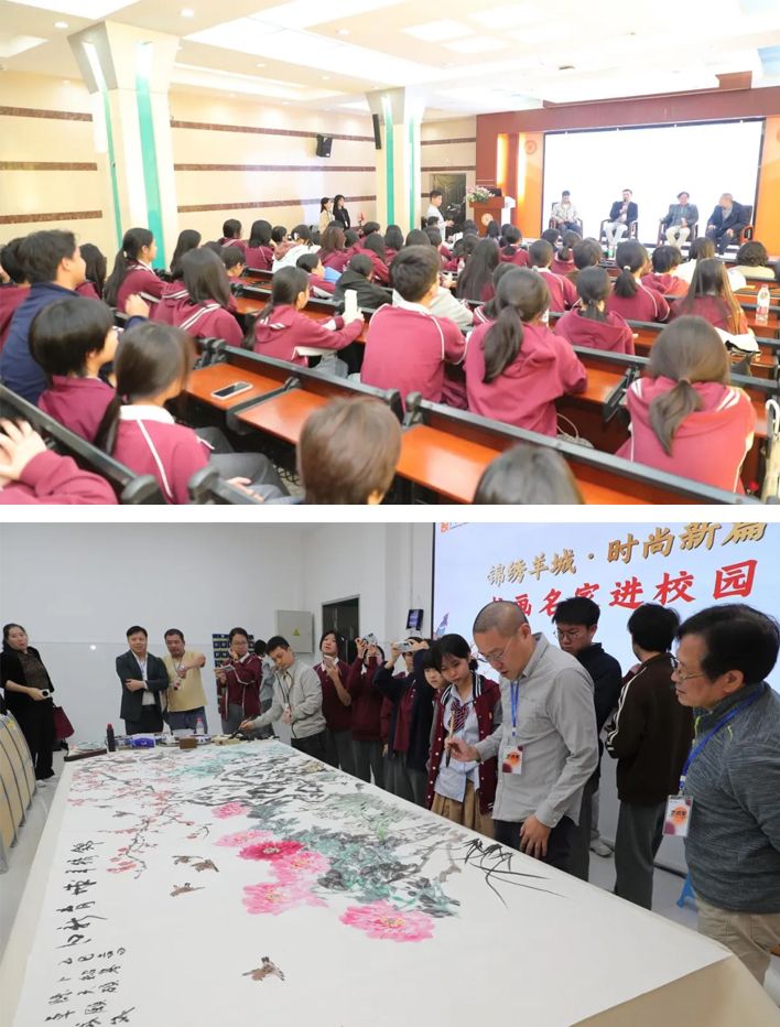 随后,四位名家移步特制的大型画板(3.6米×1.4米)前,围绕“锦绣羊城·时尚新篇”主题,即兴挥毫,携手创作。精湛的技艺让同学们近距离感受到中国画的独特魅力。大家屏息凝神,认真观摩每一个创作细节,不时发出由衷的赞叹,在潜移默化中接受着传统艺术的熏陶。