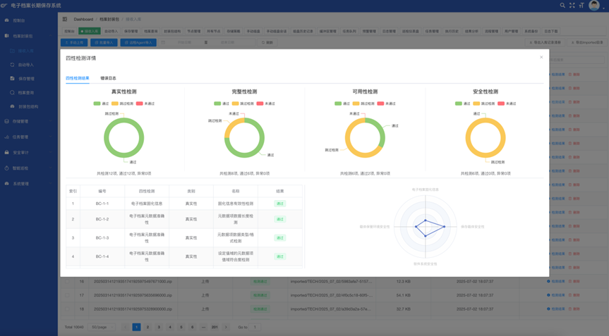 系统在数据入库前自动执行“四性”检测(真实性、完整性、可用性、安全性),确保只有合格档案进入存储环节。同时,通过持续的介质质量检测,系统可评估存储介质健康状况,及时预警潜在损坏,并自动触发数据向新介质的迁移,从而有效保障数据的长期安全与可访问性,极大降低人为干预风险。