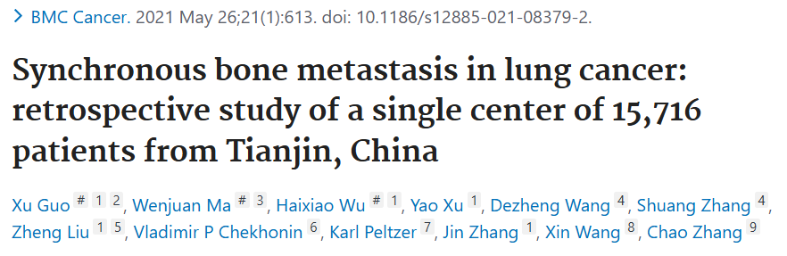 [2] Guo X, Ma W, Wu H, et al. Synchronous bone metastasis in lung cancer: Retrospective study of a single center of 15, 716 patients from Tianjin, China. BMC Cancer, 2021, 21(1): 613.