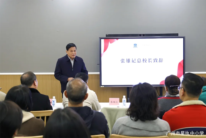 张 雄记总校长致辞中,立足民办教育新形势,剖析同质化办学难题,明确特色课程是民办学校核心竞争力,更是践行“为党育人、为国育才”的重要载体。他强调,星执融爱课程体系为跨学科项目式学习、小学鲲鹏科创、高中“1+N”等各类校本课程落地筑牢根基,拓宽了学生成长赛道、培育了创新素养,彰显全人教育理念,寄语教职工深耕特色、久久为功,实现学校与学生双向赋能。