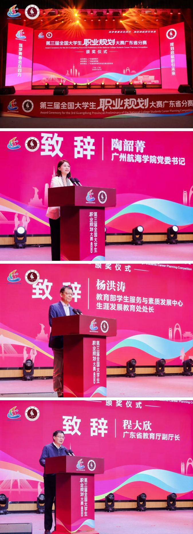 颁奖仪式上,广州航海学院党委书记陶韶菁、教育部学生服务与素质发展中心生涯发展教育处处长杨洪涛、广东省教育厅副厅长程大欣致辞,对大赛的成功举办表示祝贺,对参赛师生的积极参与和辛勤付出给予肯定,并对青年学子的职业发展寄予殷切期望。