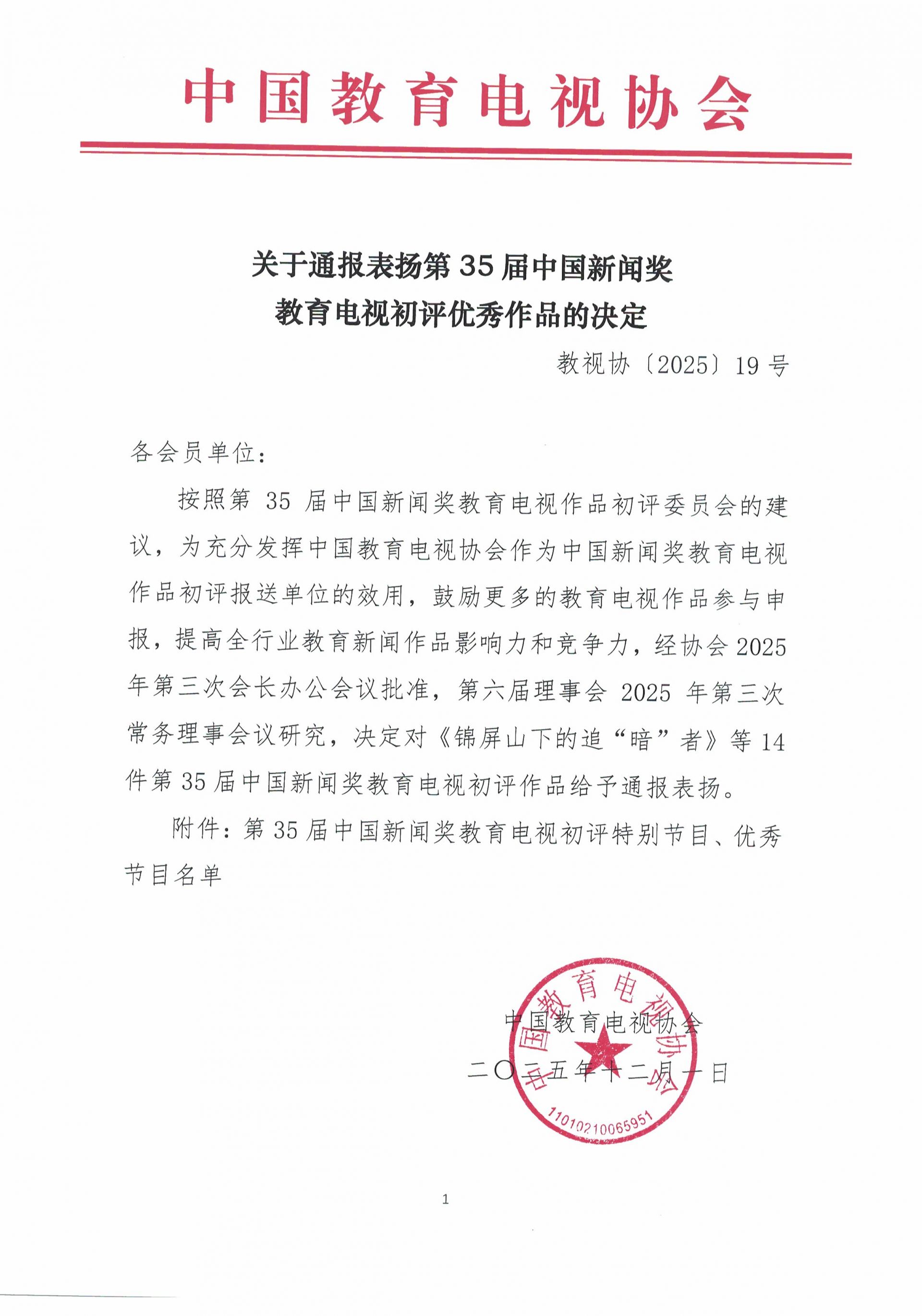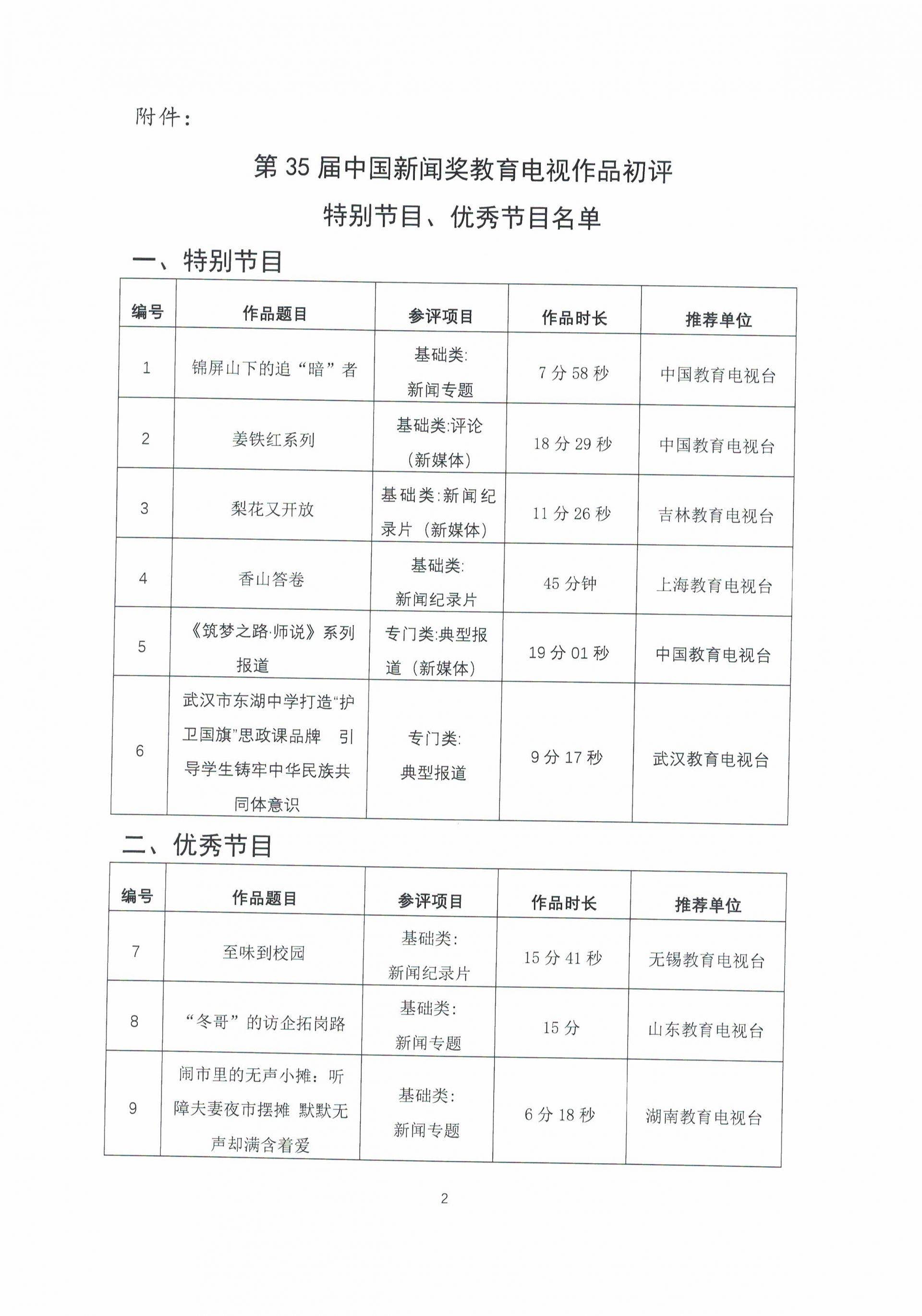 关于通报表扬第35届中国新闻奖教育电视初评优秀作品的决定