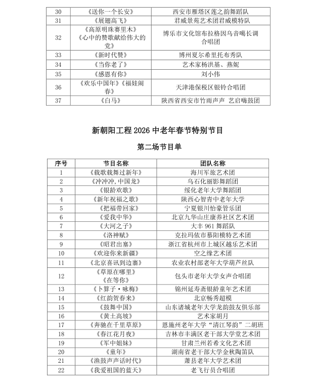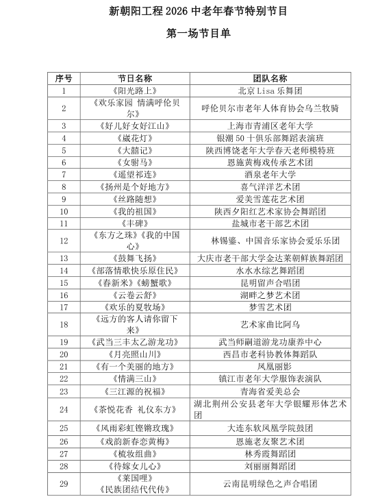 节目单:新朝阳工程2026中老年春节特别节目播出节目单(CETV-1)