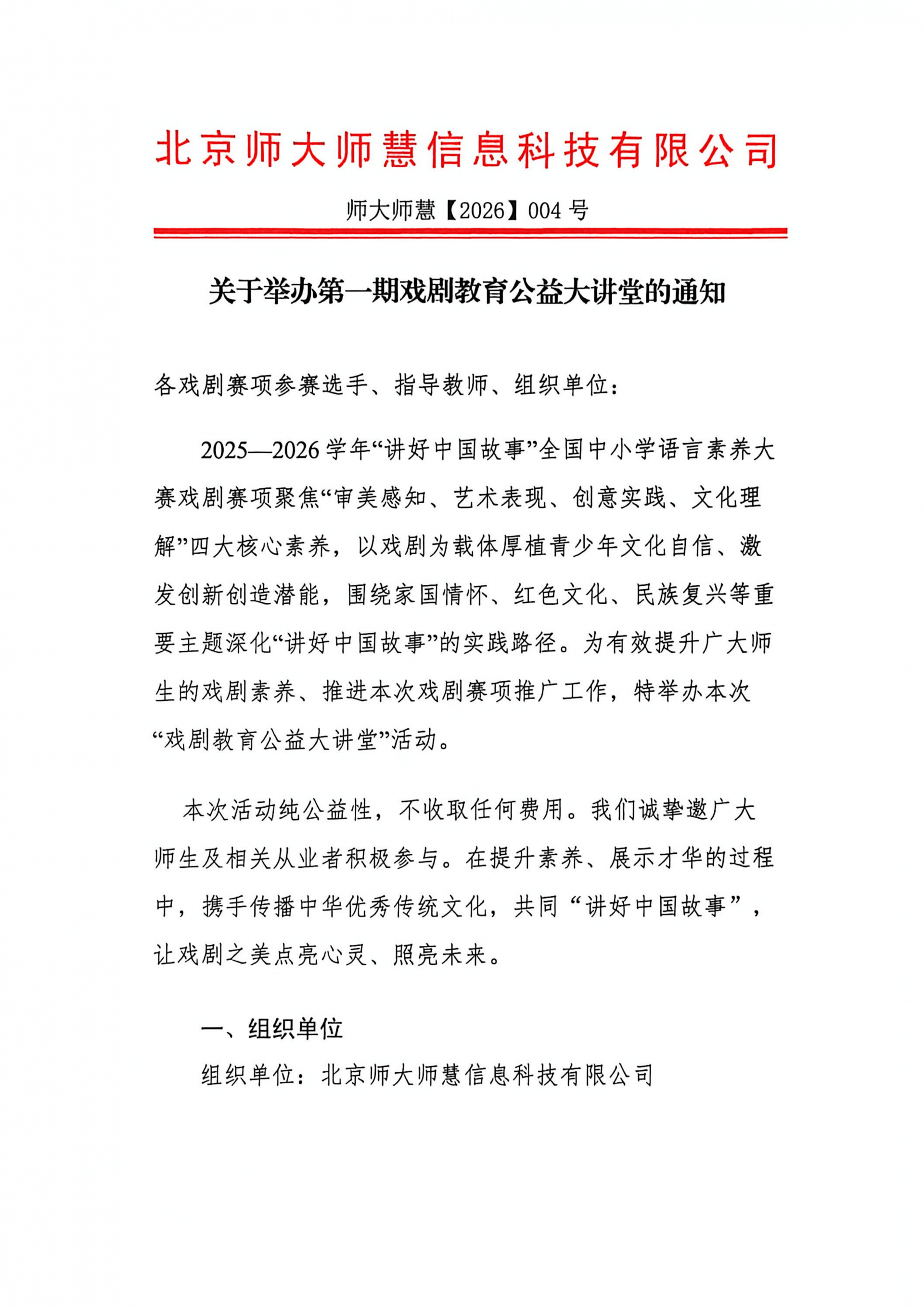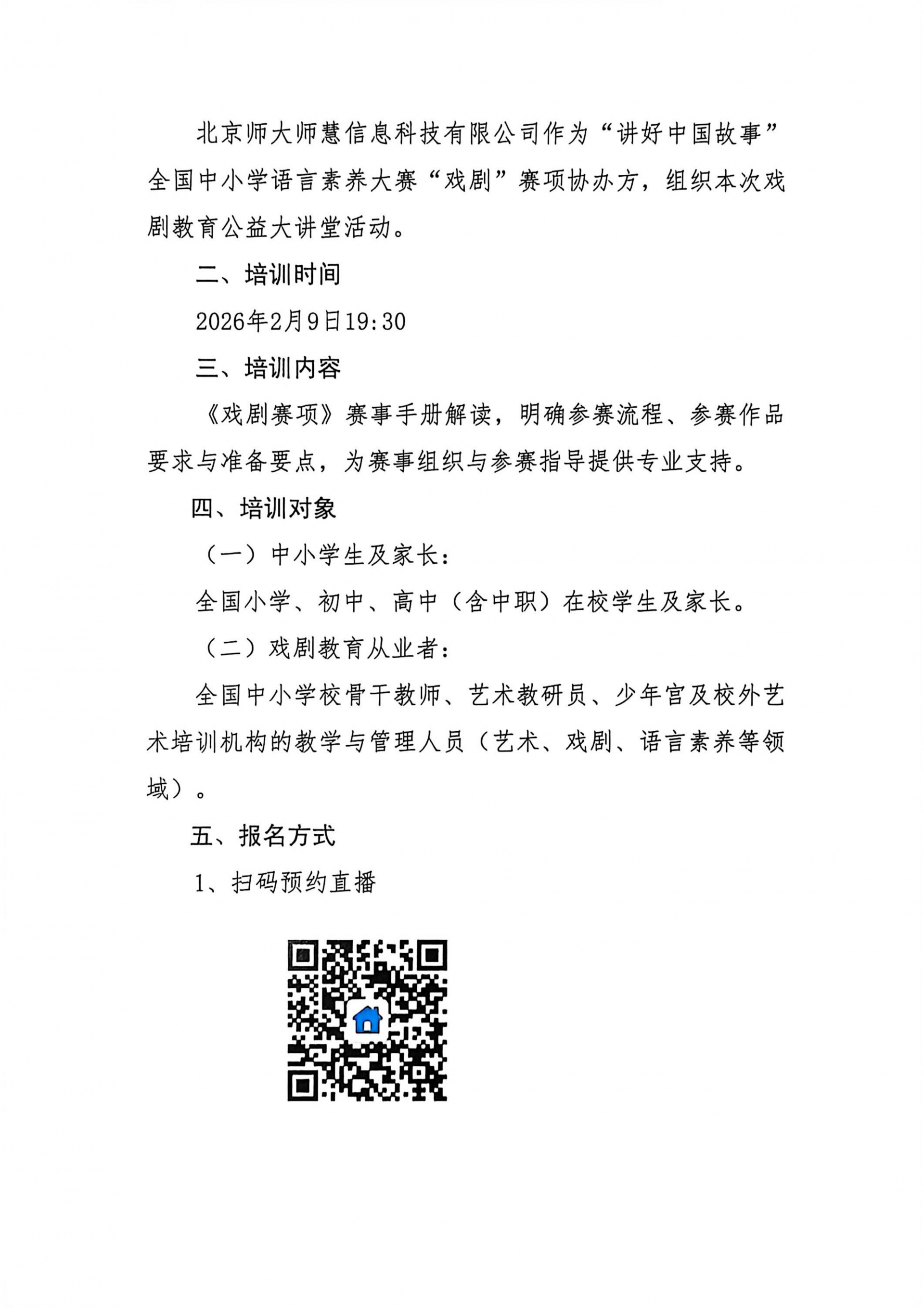 为了进一步明确戏剧赛项参赛流程、作品要求,提高教师指导水平,方便广大中小学生参赛,“讲好中国故事 ”全国中小学语言素养大赛戏剧赛项协办单位北京师大师慧信息科技有限公司定于 2026 年 2 月 9 日 19:30 以线上直播方式举办戏剧教育公益大讲堂活动。