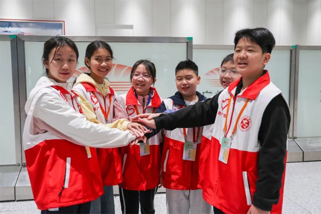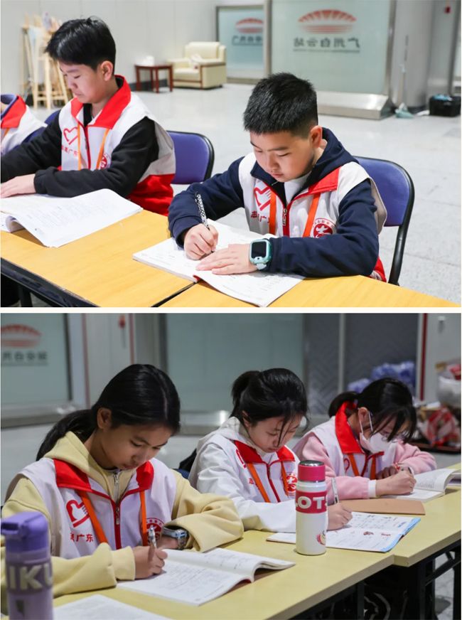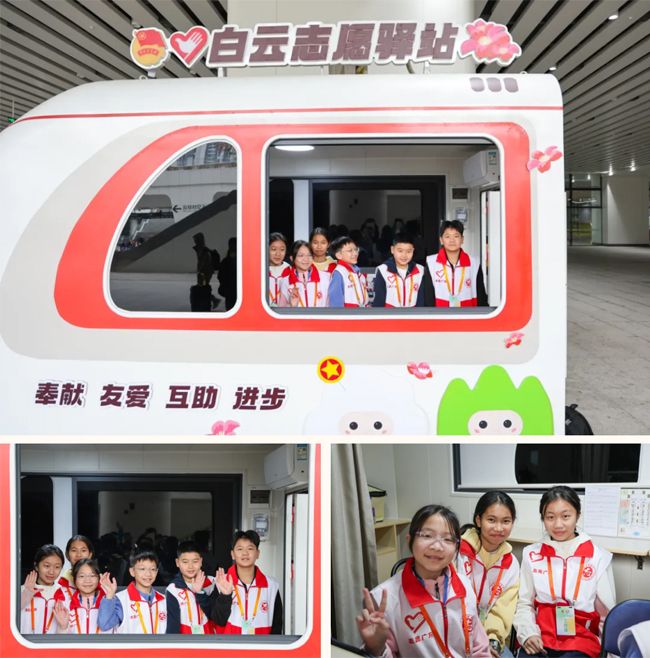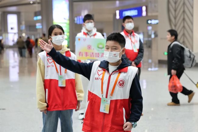 少年有志,同伴同行,周翊轩的善举也带动了身边一批同学。得知周翊轩在白云站坚持志愿服务的事迹后,同学们深受感染,纷纷主动报名,希望能和他一起参与志愿服务,用行动向他学习。在这场温暖的“突袭”中,5名同学代表来到现场,穿上鲜红的志愿服,与周翊轩并肩站在服务岗位上,主动为旅客提供帮助,从出行指引到答疑解惑,从搬运行李到秩序维护,他们精神饱满、热情投入,用实际行动践行志愿精神,真正实现了“一个带动一群”的温暖效应,展现了金沙小学学子团结友爱、乐于奉献的良好风貌。“看到周翊轩同学的事迹,我们也想为社会出一份力,和他一起传递温暖,在实践中学会担当。”参与志愿服务的同学真诚地分享道,稚嫩的脸庞上满是真诚与自豪。