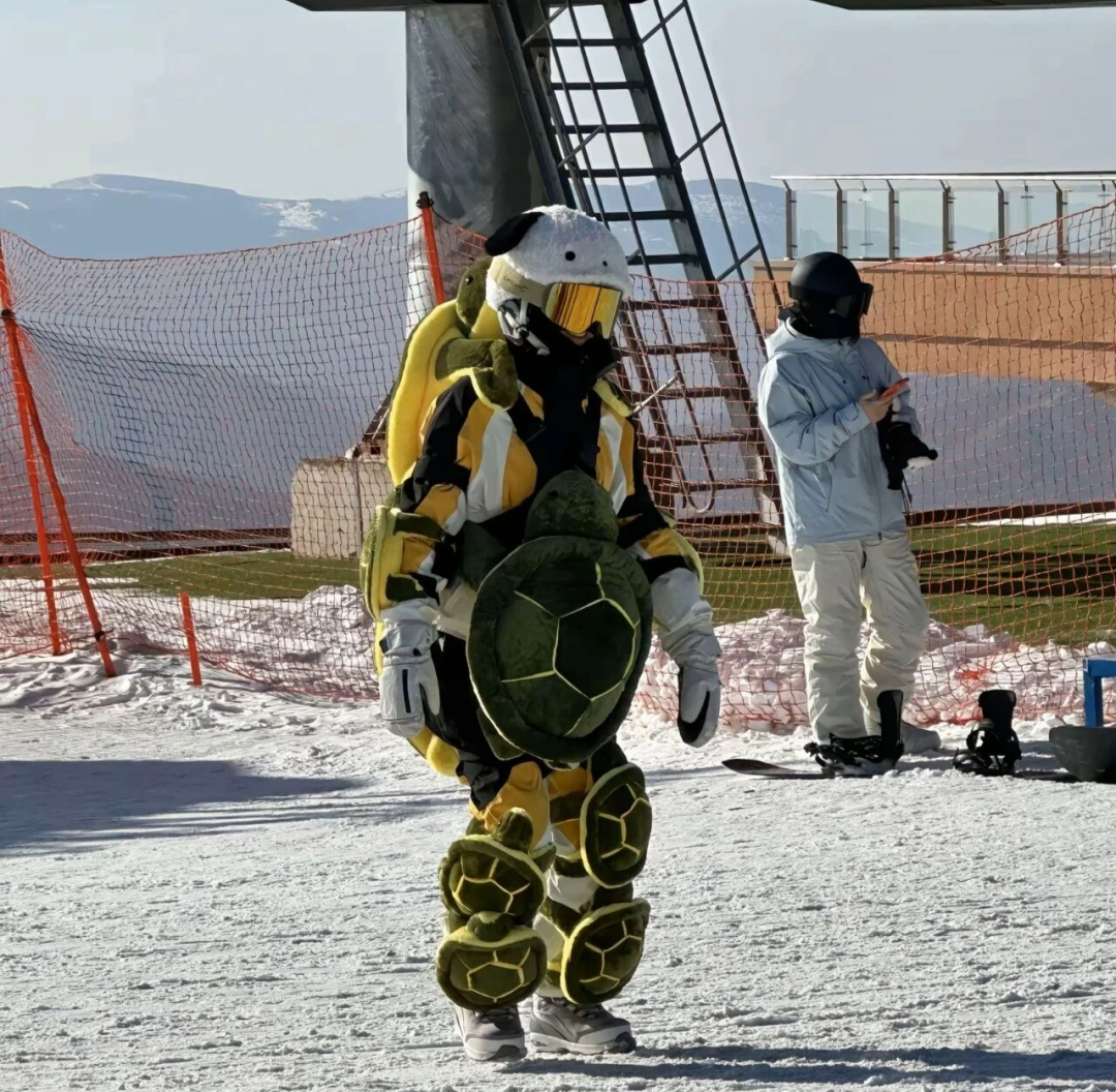 于是雪场上出现了一种“新物种”——浑身缠满小乌龟的移动毛绒玩具,远看可爱,近看心疼。