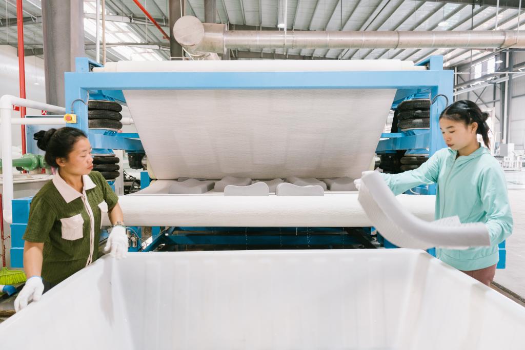 在西双版纳勐巴拉娜西乳胶制品有限公司,工人正在制作乳胶床上用品。(查巍 摄)