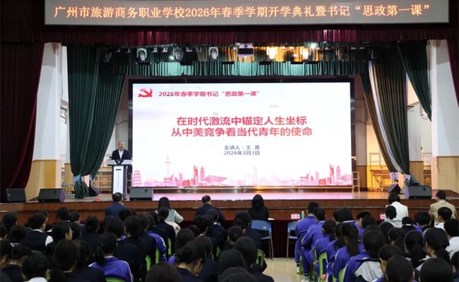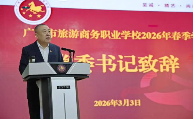 春风送暖,万物竞发。在这充满生机与希望的季节,广州市旅游商务职业学校隆重举行2026年春季学期开学典礼暨书记 “思政第一课”,全校师生齐聚一堂,共同开启新学期的奋斗篇章。学校党委书记王勇代表学校领导班子向全体师生致以新春的美好祝福和新学期的殷切期许。
