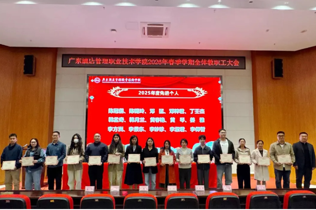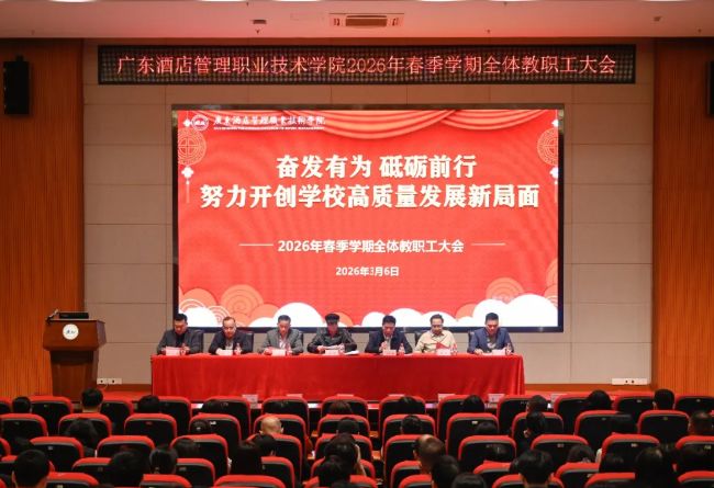 2026年3月6日下午3:00,广东酒店管理职业技术学院2026年春季学期全体教职工大会在学术报告厅温情启幕。全体校领导、各二级学院及职能部门正副职负责人,与全体教职工欢聚一堂,共话过往收获、共绘发展蓝图。
