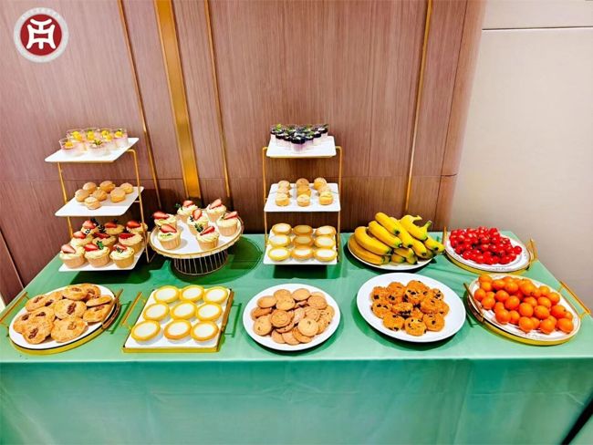 此外,酒店管理与厨艺学院中西面点工艺专业老师带领10余名学生制作了奶油布丁、酥皮泡芙、华商曲奇、萄式蛋挞、沙湾鲜奶挞、虎皮蛋糕、水果蛋糕、桃花酥、巴斯克蛋糕等茶歇点心。种类丰富的茶歇点心获得评委、专家们的一致好评,充分展示了学院的产教融合实践教学成果。