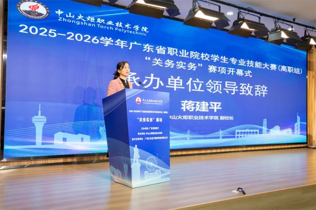 蒋建平在致辞中表示,本次大赛不仅是深化职业教育改革的重要抓手,更是推动关务人才培养模式创新的关键平台,希望能通过此次大赛进一步加强与各兄弟院校的交流合作,共同探索适应新时代需求的关务人才培养路径。她勉励全体参赛选手发扬顽强拼搏、勇于创新的精神,充分展现新时代职业院校学生的专业素养和青春风采。