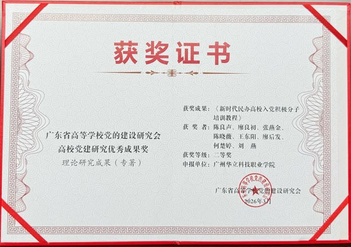近日,广东省高等学校党的建设研究会公布了高校党建研究优秀成果奖获奖名单,全省共有103项成果获奖,其中民办高职院校有3个项目上榜。广州华立科技职业学院党委书记陈良声、马克思主义学院院长廖良初等编写的《新时代民办高校入党积极分子培训教程》荣获理论研究成果(专著)二等奖,该奖项全省共评出20项,广州华立科技职业学院是该奖项唯一获奖的高职院校。