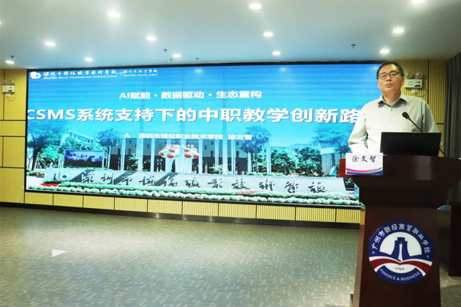 在活动第一阶段“代表发言”环节,涂文智书记作了题为《AI赋能·数据驱动·生态重构:CSMS系统支持下的中职教学创新路径》的专题报告。涂书记从“为什么做”、“怎么做”、“做得怎么样”、“将来怎么做”四个维度,系统介绍了深圳市博伦职业技术学校依托CSMS系统深化课堂教学改革的探索历程与显著成效。