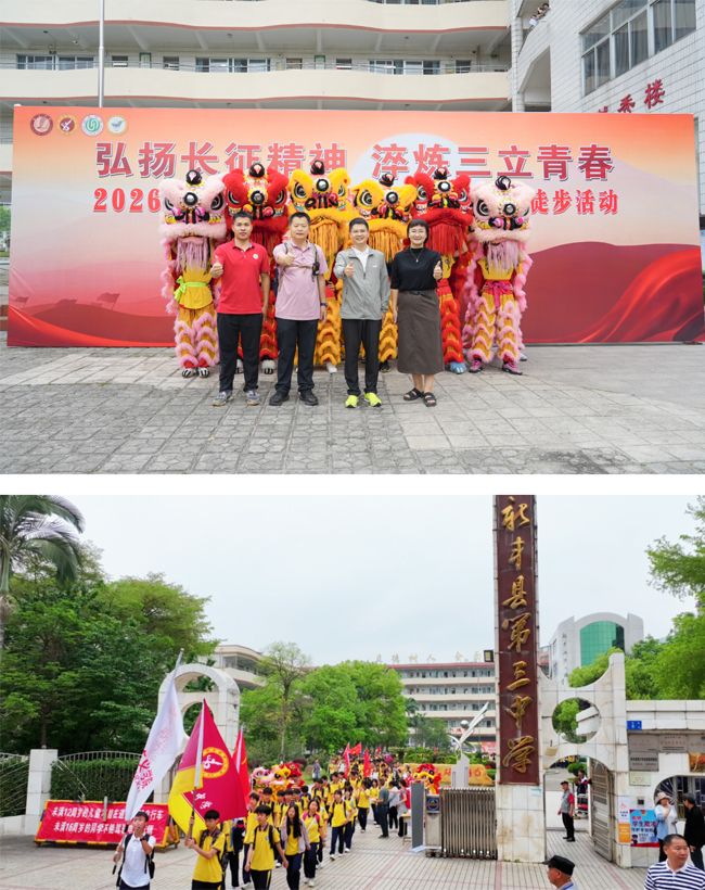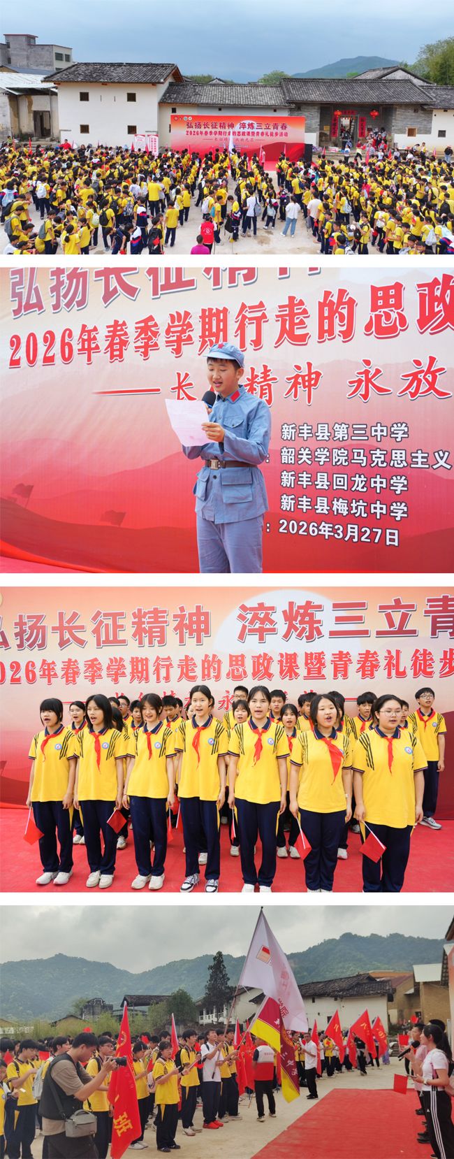 春风砺志,红土铸魂。2026年3月27日,新丰县第三中学联合韶关学院马克思主义学院、梅坑中学、回龙中学,携手家长志愿者,龙围村、龙文村、横江村、大岭村等沿线村委,县交通管理大队、西门派出所、梅坑派出所与县教育局等多部门,走进李任予故居红色教育基地,共同开展“弘扬长征精神 淬炼三立青春”行走的思政课暨八年级青春礼徒步活动。