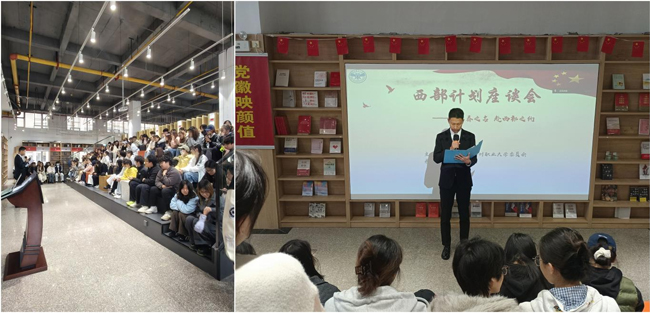 讲座伊始,现场播放了西部计划官方宣传片,主持人讲解了西部计划项目的招募对象与条件、报名流程与时间节点、服务期限与岗位分配、生活补贴与福利保障、期满就业政策等事项,让在场同学全面掌握西部计划的核心信息,扫清政策认知盲区。