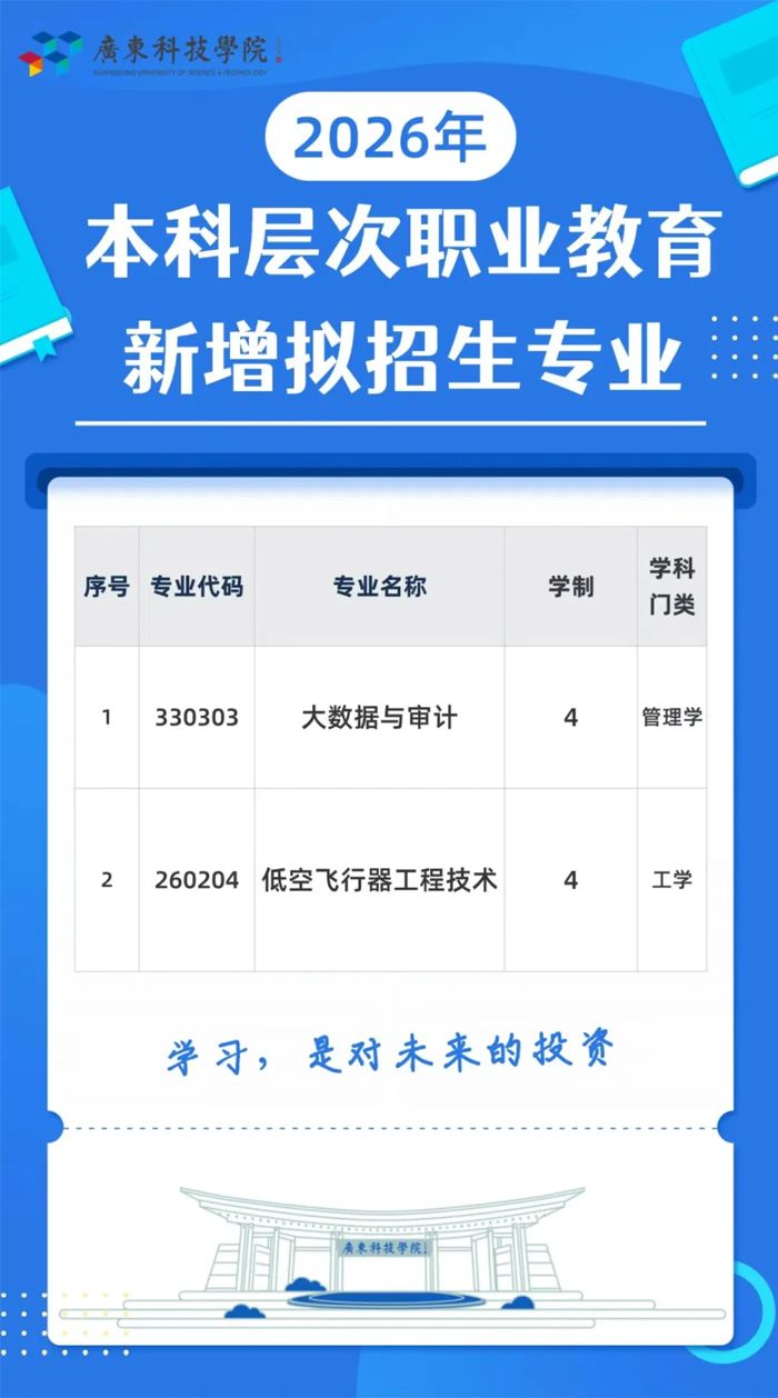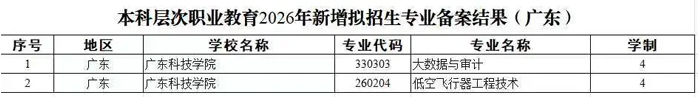 近日,教育部办公厅公布2026年本科层次职业教育专业设置备案结果,广东科技学院申报的“大数据与审计”“低空飞行器工程技术”两个专业成功获批,预计将于今年正式面向全国招生。