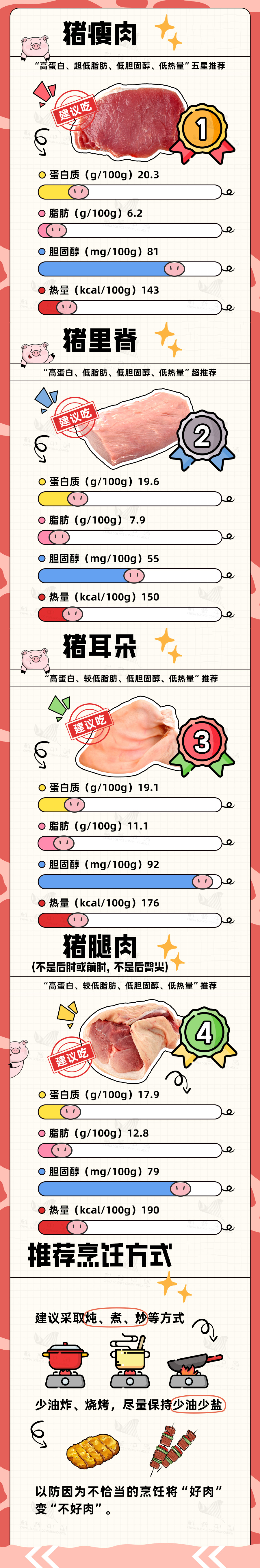 ✨按照“高蛋白、低脂肪、低胆固醇、低热量”的标准,4个部位建议吃:猪瘦肉、猪里脊、猪耳朵、猪腿肉。
