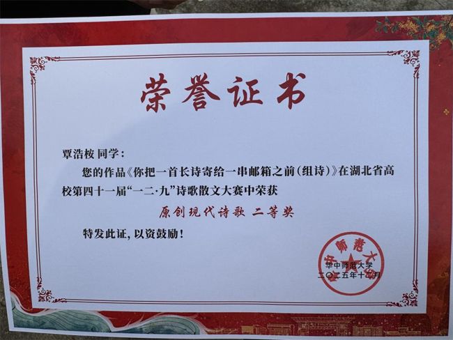 (通讯员 张诗悦 阳帅)近日,湖北省高校第四十一届“一二·九”诗歌散文大赛评选结果揭晓。鄂州职业大学航空工程学院2025级应用电子技术专业2班学生覃浩桉创作的原创组诗《你把一首长诗寄给一串邮箱之前》,荣获原创现代诗歌二等奖。