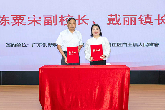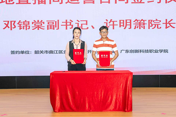 随后进入校地共建签约环节。白土镇党委副书记、镇长戴丽代表白土镇人民政府与广东创新科技职业学院陈粟宋副校长签署校地合作框架性合同。协议明确了双方在直播场地支持、技术指导、人才培养等方面的权利义务,为后续深度合作提供了制度保障。
